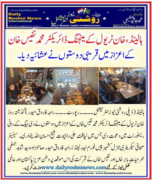 ہالینڈ ( ڈیلی روشنی نیوز انٹرنیشنل ۔۔۔۔۔ رپورٹ ۔۔۔۔ راجہ فاروق حیدر ) گذشتہ روز خان ٹریول کے مینجنگ ڈئریکٹر محمد نفیس خاں کے اعزاز میں دوستوں نے دی ہیگ کے رانی ریسٹورنٹ میں دعوت دی جس میں لیاقت علی راجپوت شیخ احسان اللہ پٹواری۔ سینیئر صحافی سیکریٹری جنر ل کشمیر پیس فورم نیدرلینڈز راجہ فاروق حیدر صاحبزادہ سید شاہد جہلمی عمر حیات بابر خاں اور نفیس خاں نے شرکت کی اس موقعہ پر وطن عزیز پاکستان اور عالمی حالات پر تبادلہ خیال کیا گیا