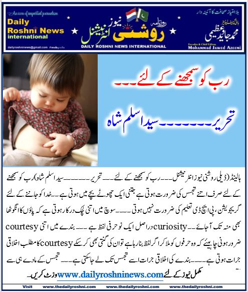 ہالینڈ(ڈیلی روشنی نیوز انٹرنیشنل ۔۔۔ رب کو سمجھنے کے لئے ۔۔۔ تحریر ۔۔۔۔۔۔۔ سید اسلم شاہ)رب کو سمجھنے کے لئے صرف اتنے تجسس کی ضرورت ہوتی ہے جتنی ایک چھوٹے بچے میں ہوتی ہے ۔۔ خدا کو جاننے کے لئے گریجویشن ، پی ایچ ڈی تعلیم کی ضرورت نہیں ہوتی ۔۔۔۔ سوچ میں اتنی لچک درکار ہوتی ہے کہ پاؤں کا انگوٹھا بھی منہ تک آجائے ۔۔curiosity دراصل ایک نو حرفی لفظ ہے ۔۔۔ بندے میں اتنی courtesy ضرور ہونی چاہیئے کہ وہ حرفوں کو ملا کر اگر لفظ بنا رہا ہے تو ان کی گنتی بھی کرسکے courtesy کا مطلب اخلاقی جرات ہوتی ہے ۔۔۔۔ بندے کی اخلاقی جرات اسے تجسس تک لے جاسکتی ہے ۔۔۔ تجسس کے مادے ہی سے متجسس بنتا ہے ۔ بچے ہر شے کو منہ میں اس لئے بھی ڈالتے ہیں کہ وہ اس کا ذائقہ بھی دیکھنا چاہتے ہیں ۔۔ رب جب اپنی خلاقی سے بچے کو الگ کرتا ہے تو وہ اپنے نور کا ایک نکتہ اس کے بدن پر ہمیشہ کے لئے لکھ دیتا ہے ۔۔ جسے ہم ناف کہتے ہیں ۔۔۔ ناف کا مطلب ہے کہ ایک وقت ایسا بھی تھا کہ تو منہ میں لقمہ بھی نہیں ڈال سکتا تھا اس وقت بھی کوئی تھا جسے تیری بھوک کا خیال تھا تیرے جسم کا خیال تھا تیری تکمیل کی خواہش تھی ۔۔۔اسے navel کے نام سے بھی جانا جاتا ہے ۔۔۔