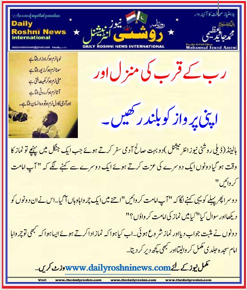 ہالینڈ(ڈیلی روشنی نیوز انٹرنیشنل )دو بہت صالح آدمی سفر کرتے ہوئے جب ایک جنگل میں پہنچے تو نماز کا وقت ہو گیا دونوں ایک دوسرے کی عزت کرتے ہوئے ایک دوسرے سے کہنے لگے کہ ” آپ امامت کروائیں “