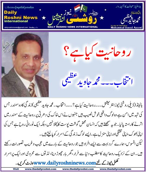 ہالینڈ(ڈیلی روشنی نیوز انٹرنیشنل ۔۔۔ روحانیت کیا ہے ؟ ۔۔۔ انتخاب ۔ محمد جاوید عظیمی)زندگی کا وہ سمندر جس کی تہہ میں امن ہے وہ لوگ واقعی خوش نصیب ہیں جنہوں نے اس خاک کی دھرتی پر روحانیت کے سمندر میں اترنے کا راستہ پا لیا۔ جو یہ سمجھتے ہیں کہ انسان محض گوشت پوست کا پُتلا نہیں، بلکہ ایک نورانی روح ہے جس کی اپنی بھوک، اپنی تشنگی اور اپنی منزل ہے۔ ایسے لوگ زندگی کے اسرار کو پا لیتے ہیں۔