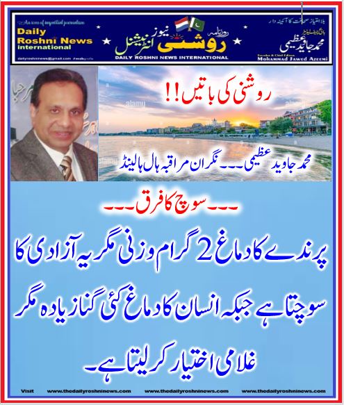روشنی کی باتیں۔۔محمد جاوید عظیمی۔۔۔ نگران مراقبہ ہال ہالینڈ / ہالینڈ کی خبریں, اقوال زریں / By Daily Roshni News روشنی کی باتیں محمد جاوید عظیمی۔۔۔ نگران مراقبہ ہال ہالینڈ ۔۔۔سوچ کا فرق۔۔۔ پرند ے کا دماغ 2گرام وزنی مگر یہ آزادی کا سوچتا ہے جبکہ انسان کا دماغ کئی گنا زیادہ مگر غلامی اختیار کر لیتا ہے۔