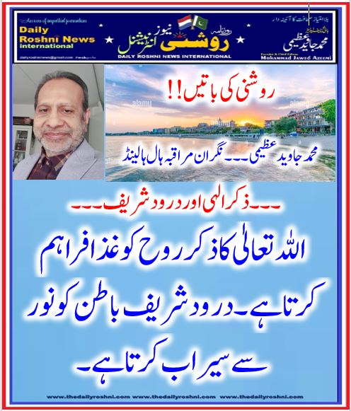 روشنی کی باتیں۔۔۔محمد جاوید عظیمی۔۔۔ نگران مراقبہ ہال ہالینڈ / ہالینڈ کی خبریں, متفرق نگارشات / By Daily Roshni News روشنی کی باتیں محمد جاوید عظیمی۔۔۔ نگران مراقبہ ہال ہالینڈ ۔۔۔ذکر الہی اور درود شریف۔۔۔ اللہ تعالیٰ کا ذکر روح کو غذا فراہم کرتا ہے۔ درود شریف باطن کو نوز سے سیراب کرتا ہے۔