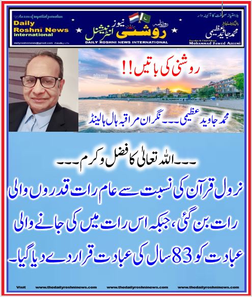 روشنی کی باتیں۔۔۔محمد جاوید عظیمی۔۔۔ نگران مراقبہ ہال ہالینڈ / ہالینڈ کی خبریں, اقوال زریں / By Daily Roshni News روشنی کی باتیں محمد جاوید عظیمی۔۔۔ نگران مراقبہ ہال ہالینڈ ۔۔۔اللہ تعالیٰ کا فضل و کرم۔۔۔ نرول قرآن کی نسبت سے عام رات قدروں والی رات بن گئی، جبکہ اس رات میں کی جانے والی عبادت کو 83سال کی عبادت قرار دے دیا گیا۔