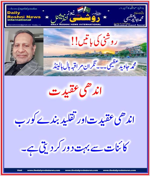 روشنی کی باتیں…محمد جاوید عظیمی۔۔۔ نگران مراقبہ ہال ہالینڈ / ہالینڈ کی خبریں, اقوال زریں / By Daily Roshni News روشنی کی باتیں محمد جاوید عظیمی۔۔۔ نگران مراقبہ ہال ہالینڈ اندھی عقیدت اندھی عقیدت اور تقلید بندے کو رب کائنات سے بہت دور کر دیتی ہے۔