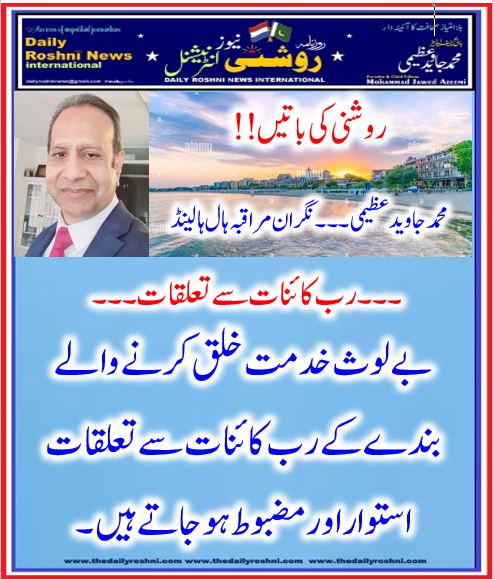 روشنی کی باتیں.۔۔۔محمد جاوید عظیمی۔۔۔ نگران مراقبہ ہال ہالینڈ / ہالینڈ کی خبریں, اقوال زریں / By Daily Roshni News روشنی کی باتیں محمد جاوید عظیمی۔۔۔ نگران مراقبہ ہال ہالینڈ ۔۔۔رب کائنات سے تعلقات۔۔۔ بے لوث خدمت خلق کرنے والے بندے کے رب کائنات سے تعلقات استوار اور مضبوط ہو جاتے ہیں۔