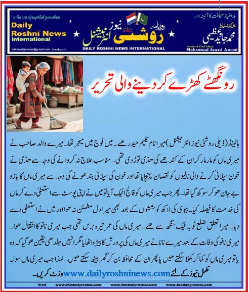 ہالینڈ(ڈیلی روشنی نیوز انٹرنیشنل )میرا نام کلیم حیدر ھے۔ میں فوج میں میجر تھا۔ میرے والد صاحب نے میری ماں کو مار مار کر ان کے کندھے کی ھڈی توڑ دی تھی۔ مناسب علاج نہ کروانے کی وجہ سے ھڈی نے خون سپلائی کرنے والی نالیوں کو نقصان پہنچایا تھا اور خون کی سپلائی بند ھونے کی وجہ سے میری ماں کا بازو بےجان هو کر سوکھ گیا تھا۔ پھر جب میری ماں کو فالج اٹیک آیا تو میں نے اپنی پوسٹ سے استعفیٰ دے کر ماں کی خدمت کا فیصلہ کیا۔ بیوی کی لاکھ کوششوں کے بعد بھی میرا دل مطمئن نہ ھوا اور میں نے استعفیٰ دے دیا ۔۔۔۔۔