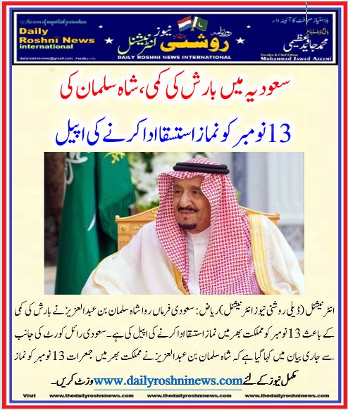انٹرنیشنل (ڈیلی روشنی نیوز انٹرنیشنل)ریاض: سعودی فرماں روا  شاہ سلمان بن عبدالعزیز نے بارش کی کمی کے باعث 13 نومبر کو مملکت بھر میں نماز استسقا ادا کرنے کی اپیل کی ہے۔