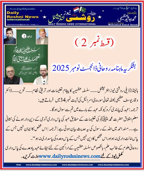 ہالینڈ(ڈیلی روشنی نیوز انٹرنیشنل ۔۔۔ سلسلہ عظیمیہ کا پیغام تعلیمات اور تربیتی نظام۔۔۔ تحریر۔۔۔ڈاکٹر وقار یوسف عظیمی)اللہ تعالیٰ سورہ بنی اسرائیل کی آیت نمبر 34 میں