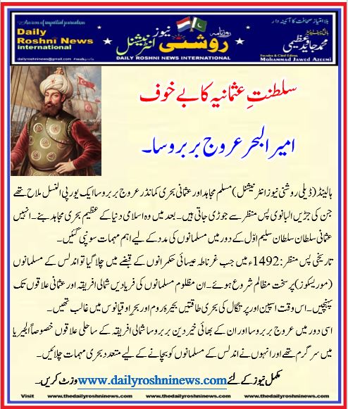 ہالینڈ(ڈیلی روشنی نیوز انٹرنیشنل )مسلم مجاہد اور عثمانی بحری کمانڈرعروج بربروسا ایک یورپی النسل ملاح تھے جن کی جڑیں البانوی پس منظر سے جوڑی جاتی ہیں۔ بعد میں وہ اسلامی دنیا کے عظیم بحری مجاہد بنے۔ انہیں عثمانی سلطان سلطان سلیم اوّل کے دور میں مسلمانوں کی مدد کے لیے اہم مہمات سونپی گئیں۔