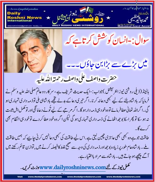 ہالینڈ(ڈیلی روشنی نیوز انٹرنیشنل )جواب:-ایک حدیث شریف ہے ، سرکار دو عالمؐ صلی اللہ علیہ وسلم نے فرمایا کہ بادشاہ بننے کے لیے کبھی دعا نہ کرنا ۔ اگر تیری دعا کے بدلے تجھے بادشاہی ملی تو ذمہ داری تمہاری ہو گی ۔ اگر اللہ تعالیٰ عطا فرمائے تو وہ خود ہی ذمہ دار ہو گا ۔ اگر مرتبے کے لیے تُو نے دعا مانگی اور تو مکمل اہل ثابت نہ ہو سکا تو پھر اسکا بوجھ اٹھانے کی ذمہ داری تمہاری ہو گی لیکن اگر وہ خود عطا کردے تو خود ہی انتظام بھی کرے گا ۔