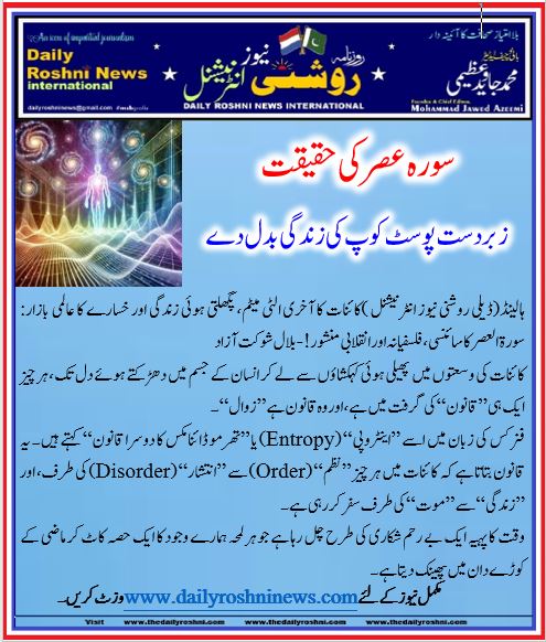ہالینڈ(ڈیلی روشنی نیوز انٹرنیشنل )کائنات کا آخری الٹی میٹم، پگھلتی ہوئی زندگی اور خسارے کا عالمی بازار: سورۃ العصر کا سائنسی، فلسفیانہ اور انقلابی منشور! – بلال شوکت آزاد