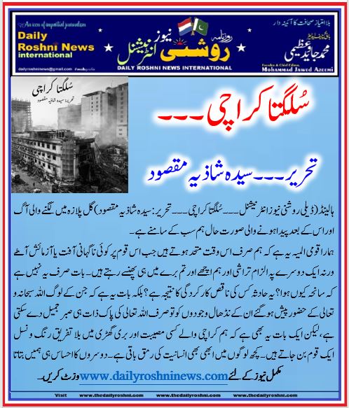 ہالینڈ(ڈیلی روشنی نیوز انٹرنیشنل ۔۔۔ سُلگتا کراچی۔۔۔ تحریر: سیدہ شاذیہ مقصود)گل پلازہ میں لگنے والی آگ اور اس کے بعد پیدا ہونے والی صورت حال ہم سب کے سامنے ہے۔
