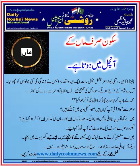ہالینڈ(ڈیلی روشنی نیوز انٹرنیشنل )کل رات ایک ایسا واقعہ ہوا جس نے زندگی کی کئی پہلوؤں کو چھو لیا۔ قریب شام کے7 بجےہونگے، موبائل کی گھنٹی بجی۔ فون اٹھایا تو ادھر سے رونے کی آواز۔۔۔