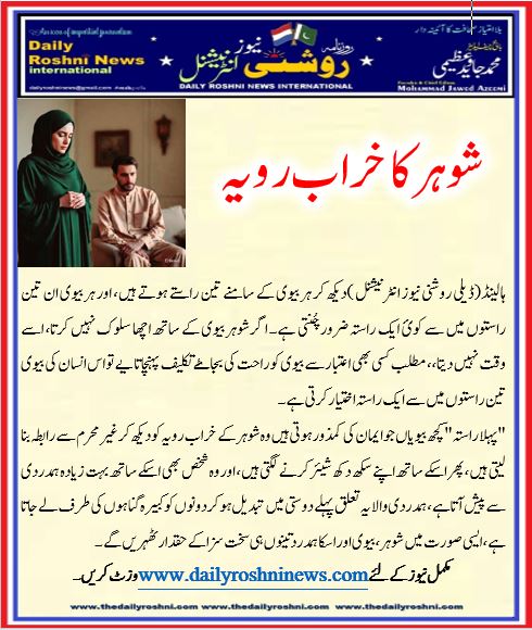ہالینڈ(ڈیلی روشنی نیوز انٹرنیشنل )دیکھ کر ہر بیوی کے سامنے تین راستے ہوتے ہیں، اور ہر بیوی ان تین راستوں میں سے کوئ ایک راستہ ضرور چُنتی ہے۔ اگر شوہر بیوی کے ساتھ اچھا سلوک نہیں کرتا، اسے وقت نہیں دیتا،، مطلب کسی بھی اعتبار سے بیوی کو راحت کی بجاۓ تکلیف پہنچاتا یے تو اس انسان کی بیوی تین راستوں میں سے ایک راستہ اختیار کرتی ہے۔