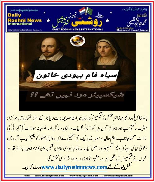 ہالینڈ(ڈیلی روشنی نیوز انٹرنیشنل )شیکسپیئر کی ادبی میراث صدیوں سے دنیا بھر کے ادبی حلقوں میں مرکزی حیثیت رکھتی ہے اور ان کی تحریروں کو انسانی نفسیات، سماجی مسائل اور فلسفیانہ سوالات کی گہرائی کی علامت سمجھا جاتا ہے۔ تاہم حالیہ برسوں میں ایک نئی تحقیق نے اس روایتی تصور کو چیلنج کیا ہے جس میں دعویٰ کیا گیا ہے کہ ولیم شیکسپیئر دراصل ایک سیاہ فام یہودی خاتون تھیں جن کا نام ایمیلیا باسانو تھا اور انہوں نے شیکسپیئر کے قلمی نام سے مشہور تمام ڈرامے اور شاعری تخلیق کی۔