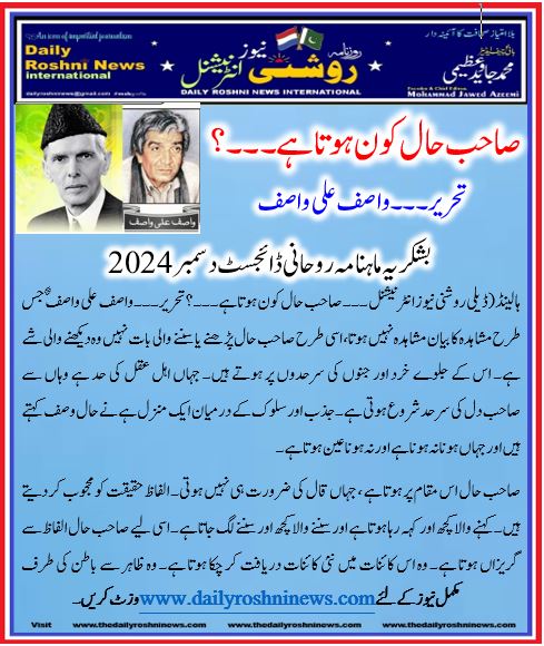 ہالینڈ(ڈیلی روشنی نیوز انٹرنیشنل ۔۔۔ صاحب حال کون ہوتا ہے۔۔۔؟تحریر۔۔۔واصف علی واصف) جس طرح مشاہدہ کا بیان مشاہدہ نہیں ہوتا، اسی طرح صاحب حال پڑھنے یا سننے والی بات نہیں وہ دیکھنے والی شے ہے۔ اس کے جلوے خرد اور جنوں کی سرحدوں پر ہوتے ہیں۔ جہاں اہل عقل کی حد ہے وہاں سے صاحب دل کی سرحد شروع ہوتی ہے۔ جذب اور سلوک کے درمیان ایک منزل ہے نے حال وصف کہتے ہیں اور جہاں ہونا نہ ہونا ہے اور نہ ہوناعین ہوتا ہے۔