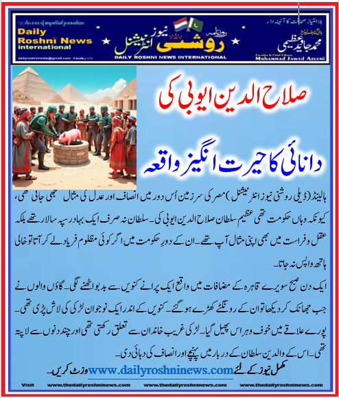 ہالینڈ(ڈیلی روشنی نیوز انٹرنیشنل )مصر کی سرزمین اُس دور میں انصاف اور عدل کی مثال سمجھی جاتی تھی، کیونکہ وہاں حکومت تھی عظیم سلطان صلاح الدین ایوبی کی۔ سلطان نہ صرف ایک بہادر سپہ سالار تھے بلکہ عقل و فراست میں بھی اپنی مثال آپ تھے۔ ان کے دورِ حکومت میں اگر کوئی مظلوم فریاد لے کر آتا تو خالی ہاتھ واپس نہ جاتا۔