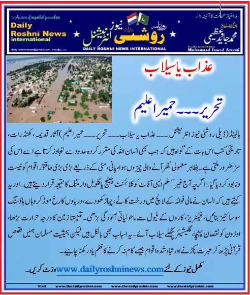 ہالینڈ(ڈیلی روشنی نیوز انٹرنیشنل ۔۔۔ عذاب یا سیلاب۔۔۔ تحریر۔۔۔حمیراعلیم )آثار قدیمہ، کھنڈرات، تاریخی کتب اس بات کے گواہ ہیں کہ جب بھی انسان اللہ کی مقرر کردہ حدود سے تجاوز کرتا ہے اسے اس کی سزا ضرور ملتی ہے۔ بظاہر معمولی نظر آنے والی چیزوں ہوا، پانی، مٹی کے ذریعے بڑی بڑی طاقتور اقوام کو نیست و نابود کر دیا گیا۔اگرچہ آج غیر مسلم ایسی آفات کو کلائمنٹ چینج یا گلوبل وارمنگ کا نتیجہ قرار دیتے ہیں۔اور یہ کہتے ہیں کہ انسان نے مالی فوائد کے لالچ میں درخت کاٹے، پہاڑ کھودے، دریاوں کا رخ موڑ کر وہاں ہاؤسنگ سوسائٹیز بنائیں، فیکٹریز، کاروں کے فیول سے ماحولیاتی آلودگی بڑھی۔نتیجتا زمین کا درجہ حرارت بڑھا، اوزون کو نقصان پہنچا، گلیشیئر پگھلے سیلاب آئے۔یہ اسباب بھی بالکل ہیں لیکن بحیثیت مسلمان ہمیں قصص قرآنی پڑھ کر عبرت پکڑنے اور تباہ شدہ اقوام جیسے کام نہ کرنے کا حکم یاد رکھنا چاہیے۔