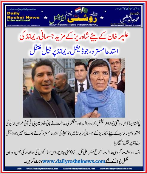 چیئرمین پی ٹی آئی عمران خان کی ہمشیرہ علیمہ خان کے بیٹے شاہ ریز کے جسمانی ریمانڈ میں توسیع کی استدعا مسترد کرتے ہوئے انہیں جوڈیشل ریمانڈ پر جیل بھیج دیا۔