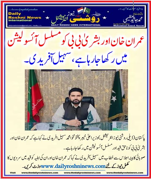 پاکستان(ڈیلی روشنی نیوز انٹرنیشنل ) وزیر اعلیٰ خیبر پختونخوا محمد سہیل افریدی نے کہا ہے کہ عمران خان اور بشریٰ بی بی کو ناحق قید اور مسلسل آئسولیشن میں رکھا جا رہا ہے۔