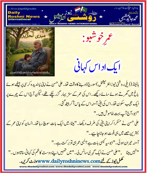 ہالینڈ(ڈیلی روشنی نیوز انٹرنیشنل )سورج ڈوبنے کا وقت تھا۔ علی حسن نے اپنی پسندیدہ کرسی پر بیٹھے ہوئے باغ میں گھرتے ہوئے سائے دیکھے۔ اس کی عمر کے ستر بہار گزر چکے تھے، لیکن آج اس کے چہرے پر ایک عجیب سکون تھا۔ اس کی بیٹی آمنہ اس کے پاس آ کر بیٹھ گئی۔