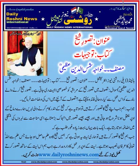 ہالینڈ(ڈیلی روشنی نیوز انٹرنیشنل ۔۔۔ عنوان : تصورِ شیخ۔۔۔ کتاب : توجیہات۔۔۔  مصنف : خواجہ شمس الدین عظیمی)سوال: تصوف میں تصور شیخ کے مراقبہ کو خصوصی اہمیت دی جاتی ہے۔ تصور شیخ کرنے والے بندے کو اس عمل سے کیا روحانی فائدہ پہنچتا ہے؟