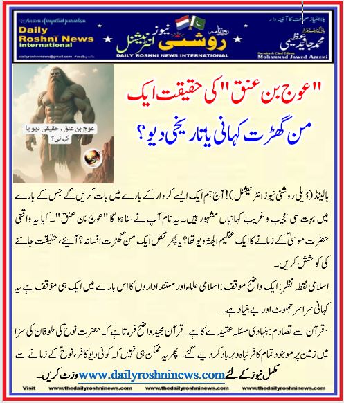 ہالینڈ(ڈیلی روشنی نیوز انٹرنیشنل )! آج ہم ایک ایسے کردار کے بارے میں بات کریں گے جس کے بارے میں بہت سی عجیب و غریب کہانیاں مشہور ہیں۔ یہ نام آپ نے سنا ہو گا “عوج بن عنق”۔ کیا یہ واقعی حضرت موسیٰ ؑ کے زمانے کا ایک عظیم الجثہ دیو تھا؟ یا پھر محض ایک من گھڑت افسانہ؟ آئیے، حقیقت جاننے کی کوشش کریں۔