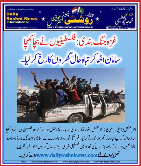 انٹرنیشنل (ڈیلی روشنی نیوز انٹرنیشنل )غزہ جنگ بندی معاہدہ نافذ العمل ہونے کے بعد فلسطینیوں نے بچا کھچا سامان اٹھا کر اپنے تباہ حال گھروں کا رخ کرلیا۔