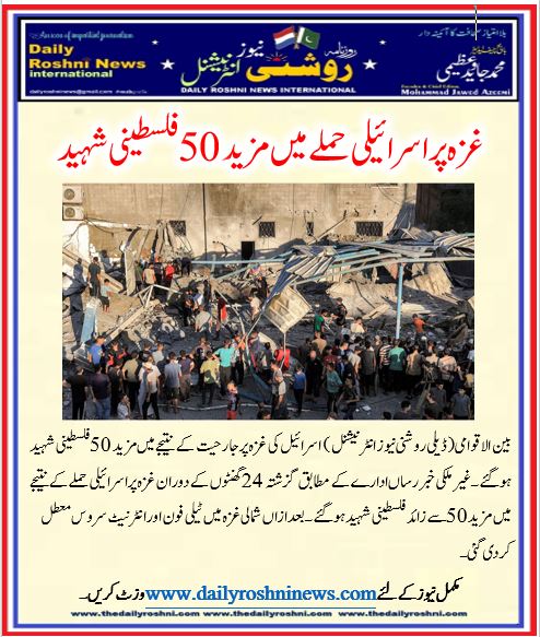 بین الاقوامی (ڈیلی روشنی نیوز انٹرنیشنل ) اسرائیل کی غزہ پر جارحیت کے نتیجے میں مزید 50 فلسطینی شہید ہوگئے۔