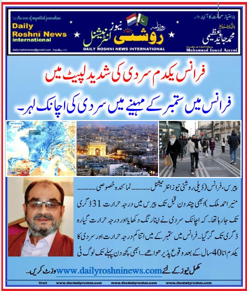 پیرس، فرانس ( ڈیلی روشنی نیوز انٹرنیشنل ۔۔۔۔۔ نمائندہ خصوصی ۔۔۔۔۔ منیر احمد ملک )ابھی چند دن قبل تک پیرس میں درجہ حرارت 31 ڈگری تک جا رہا تھا۔ کہ اچانک سردی نے اپنا رنگ دکھایا اور درجہ حرارت گیارہ ڈگری تک گر گیا۔ فرانس میں ستمبر کے میں اتنا کم درجہ حرارت اور سردی کا یکدم انا 40 سال کے بعد وقوع پذیر ھوا ھے۔ابھی کچھ دن پہلے تک لوگ ٹی شرٹس اور شارٹس میں گھوم رھے تھے کہ موسم نے اچانک انگڑائی لیکر انھیں جیکٹس پہننے پر مجبور کر دیا