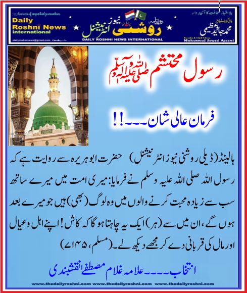 ہالینڈ(ڈیلی روشنی نیو زانٹرنیشنل) حضرت ابو ہریرہ ؓ سے روایت ہے کہ رسول اللہ صلی اللہ علیہ وسلم نےفرمایا:میری امت میں میرے ساتھ سب سے زیادہ محبت کرنے والوں میں وہ لوگ (بھی) ہیں جو میرے بعد ہوں گے ، ان میں سے (ہر) ایک یہ چاہتا ہوگا کہ کاش! اپنے اہل وعیال اور مال کی قربانی دے کرمجھے دیکھ لے۔(مسلم، ۷۱۴۵)