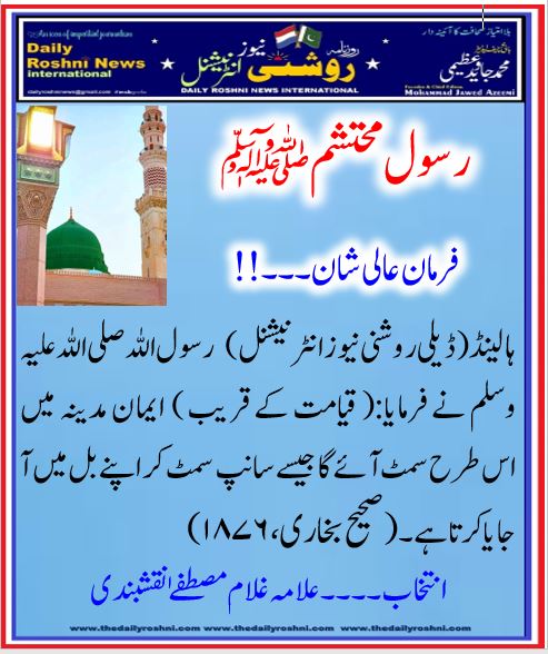 ہالینڈ(ڈیلی روشنی نیو زانٹرنیشنل) رسول اللہ صلی اللہ علیہ وسلم نے فرمایا:‏( قیامت کے قریب )  ایمان مدینہ میں اس طرح سمٹ آئے گا جیسے سانپ سمٹ کر اپنے بل میں آ جایا کرتا ہے ۔‏(صحیح بخاری، ۱۸۷۶)