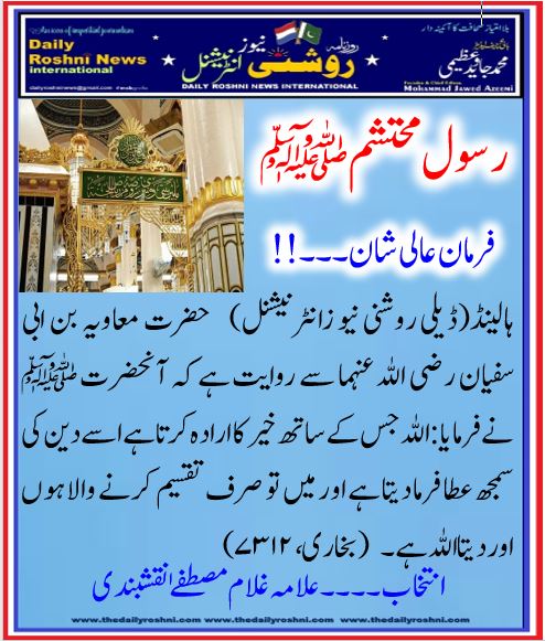 ہالینڈ(ڈیلی روشنی نیو زانٹرنیشنل) حضرت معاویہ بن ابی سفیان رضی اللہ عنہما سے روایت ہے کہ آنحضرت ﷺ نے فرمایا:‏اللہ جس کے ساتھ خیر کا ارادہ کرتا ہے اسے دین کی سمجھ عطا فرما دیتا ہے اور میں تو صرف تقسیم کرنے والا ہوں اور دیتا اللہ ہے۔ ‏(بخاری، ۷۳۱۲)