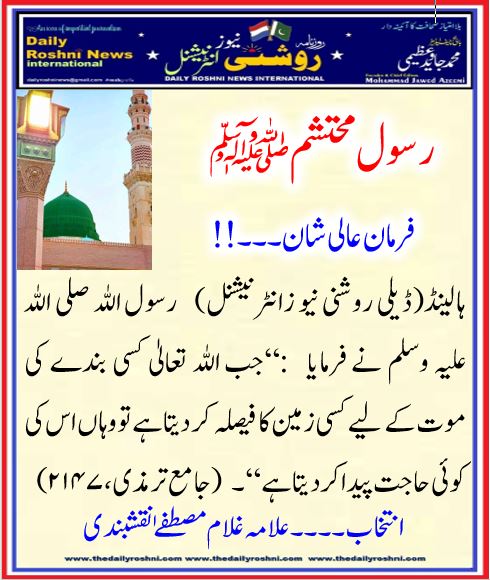 فرمان عالی شان۔۔۔!! / ہالینڈ کی خبریں, فرمان رسول / By Daily Roshni News رسول اللہ صلی اللہ علیہ وسلم نے فرمایا: “جب اللہ تعالیٰ کسی بندے کی موت کے لیے کسی زمین کا فیصلہ کر دیتا ہے تو وہاں اس کی کوئی حاجت پیدا کر دیتا ہے“۔ (جامع ترمذی ،۲۱۴۷)