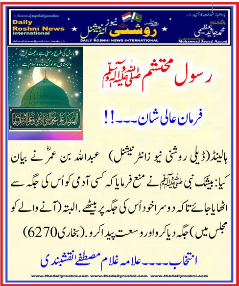 ہالینڈ(ڈیلی روشنی نیو زانٹرنیشنل) عبدالله بن عمر ؓ نے بیان کیا:بیشک نبی ﷺ نے منع فرمایا کہ کسی آدمی کو اُس کی جگہ سے اٹھایا جائے تاکہ دوسرا خود اُس کی جگہ پر بیٹھے. البتہ (آنے والے کو مجلس میں) جگہ دیا کرو اور وسعت پیدا کرو.(بخاری 6270)
