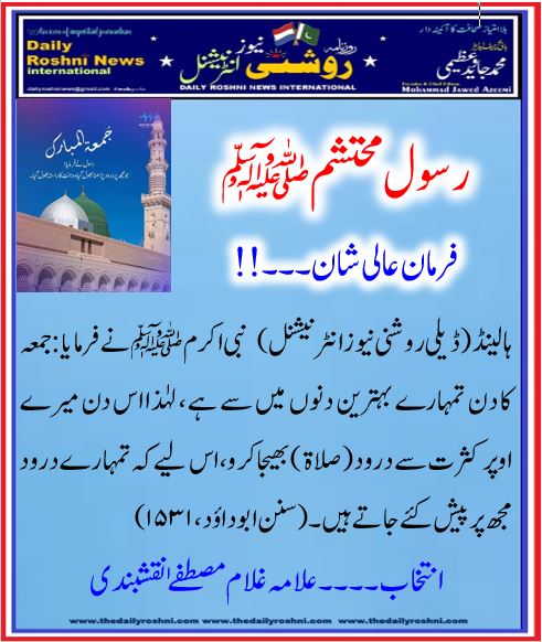 فرمان عالی شان۔۔۔!! / ہالینڈ کی خبریں, فرمان رسول / By Daily Roshni News ہالینڈ(ڈیلی روشنی نیو زانٹرنیشنل) نبی اکرم ﷺ نے فرمایا:جمعہ کا دن تمہارے بہترین دنوں میں سے ہے، لہٰذا اس دن میرے اوپر کثرت سے درود ( صلاۃ ) بھیجا کرو، اس لیے کہ تمہارے درود مجھ پر پیش کئے جاتے ہیں ۔ (سنن ابوداؤد ،۱۵۳۱) جمعہ مبارک