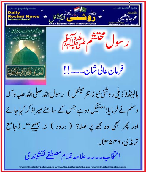 فرمان عالی شان۔۔۔!! / ہالینڈ کی خبریں, فرمان رسول / By Daily Roshni News ہالینڈ(ڈیلی روشنی نیو زانٹرنیشنل) رسول اللہ صلی اللہ علیہ وآلہ وسلم نے فرمایا: ”بخیل وہ ہے جس کے سامنے میرا ذکر کیا جائے اور پھر بھی وہ مجھ پر صلاۃ ( درود ) نہ بھیجے“۔ (جامع ترمذی،۳۵۴۶)۔ جمعہ مبارک