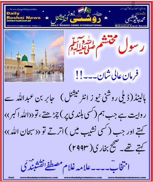 ہالینڈ(ڈیلی روشنی نیو ز  انٹرنیشنل) جابر بن عبداللہ سے روایت ہے جب ہم ( کسی بلندی پر ) چڑھتے، تو «الله اكبر» کہتے اور جب ( کسی نشیب میں ) اترتے تو «سبحان الله» کہتے تھے۔صحیح بخاری (۲۹۹۳)