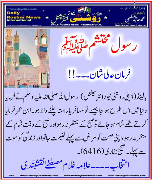 ہالینڈ(ڈیلی روشنی نیو ز انٹرنیشنل) رسول اللہ صلی اللہ علیہ وسلم نے فرمایا دنیا میں اس طرح ہو جا جیسے تو مسافر یا راستہ چلنے والا ہو۔ابن عمر فرمایا کرتے تھے شام ہو جائے تو صبح کے منتظر نہ رہو اور صبح کے وقت شام کے منتظر نہ رہو، اپنی صحت کو مرض سے پہلے غنیمت جانو اور زندگی کو موت سے پہلے۔ صحیح بخاری (6416)۔