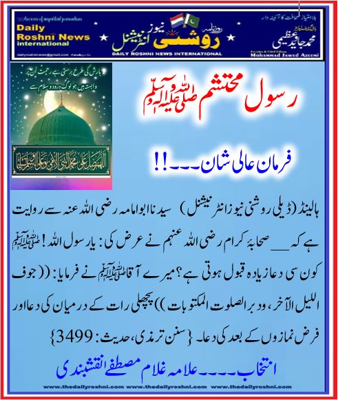 ہالینڈ(ڈیلی روشنی نیو زانٹرنیشنل) سیدنا ابوامامہ رضی اللہ عنہ سے روایت ہے کہ__ صحابۂ کرام رضی اللہ عنہم نے عرض کی : یارسول اللہ! ﷺ کون سی دعا زیادہ قبول ہوتی ہے؟ میرے آقاﷺ نے فرمایا : (( جوف اللیل الآخر ، ودبرالصلوت المکتوبات )) پچھلی رات کے درمیان کی دعا اور فرض نمازوں کے بعد کی دعا ۔{ سنن ترمذی ، حدیث : 3499 }