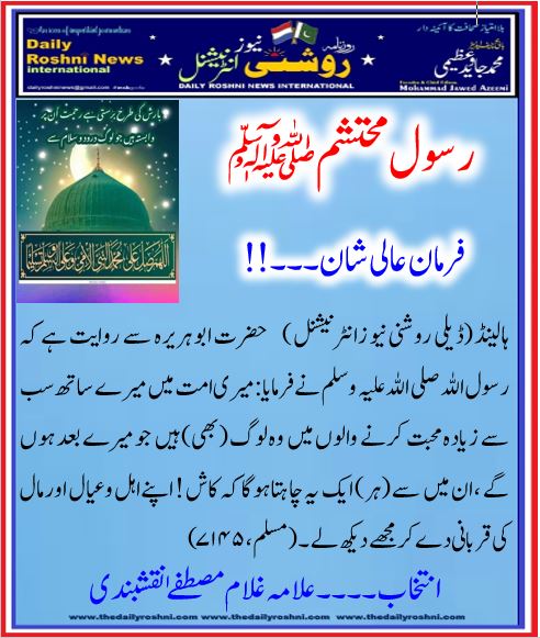 ہالینڈ(ڈیلی روشنی نیو زانٹرنیشنل) حضرت ابو ہریرہ ؓ سے روایت ہے کہ رسول اللہ صلی اللہ علیہ وسلم نےفرمایا:میری امت میں میرے ساتھ سب سے زیادہ محبت کرنے والوں میں وہ لوگ (بھی) ہیں جو میرے بعد ہوں گے ، ان میں سے (ہر) ایک یہ چاہتا ہوگا کہ کاش! اپنے اہل وعیال اور مال کی قربانی دے کرمجھے دیکھ لے۔(مسلم، ۷۱۴۵)