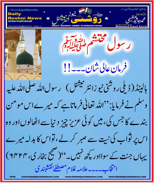 فرمان عالی شان۔۔۔!! / ہالینڈ کی خبریں, فرمان رسول / By Daily Roshni News رسول اللہ صلی اللہ علیہ وسلم نے فرمایا: ”اللہ تعالیٰ فرماتا ہے کہ میرے اس مومن بندے کا جس کی، میں کوئی عزیز چیز دنیا سے اٹھا لوں اور وہ اس پر ثواب کی نیت سے صبر کر لے، تو اس کا بدلہ میرے یہاں جنت کے سوا اور کچھ نہیں۔“ (صحیح بخاری، ۶۴۲۴)