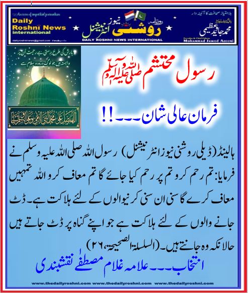 ہالینڈ(ڈیلی روشنی نیوز انٹرنیشنل) رسول اللہ صلی اللہ علیہ وسلم نے فرمایا:تم رحم کرو تم پر رحم کیا جائے گا تم معاف کرو اللہ تمہیں معاف کر ے گا سنی ان سنی کر نیوالوں کے لئے ہلاکت ہے۔ ڈٹ جانے والوں کے لئے ہلاکت ہے جو اپنے گناہ پر ڈٹ جاتے ہیں حالانکہ وہ جانتے ہیں۔(السلسلۃ الصحیحۃ ، ۲۶)