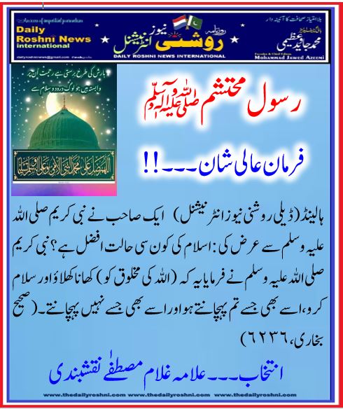 ہالینڈ(ڈیلی روشنی نیوز انٹرنیشنل) ایک صاحب نے نبی کریم صلی اللہ علیہ وسلم سے عرض کی : اسلام کی کون سی حالت افضل ہے؟نبی کریم صلی اللہ علیہ وسلم نے فرمایا یہ کہ ( اللہ کی مخلوق کو ) کھانا کھلاؤ اور سلام کرو، اسے بھی جسے تم پہچانتے ہو اور اسے بھی جسے نہیں پہچانتے۔ (صحیح بخاری ،٦٢٣٦)
