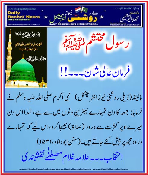 ہالینڈ(ڈیلی روشنی نیوز انٹرنیشنل) نبی اکرم صلی اللہ علیہ وسلم نے فرمایا: جمعہ کا دن تمہارے بہترین دنوں میں سے ہے، لہٰذا اس دن میرے اوپر کثرت سے درود ( صلاۃ ) بھیجا کرو، اس لیے کہ تمہارے درود مجھ پر پیش کئے جاتے ہیں ۔ (سنن ابوداؤد ،۱۵۳۱)