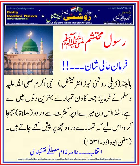 ہالینڈ(ڈیلی روشنی نیوز انٹرنیشنل) نبی اکرم صلی اللہ علیہ وسلم نے فرمایا: جمعہ کا دن تمہارے بہترین دنوں میں سے ہے، لہٰذا اس دن میرے اوپر کثرت سے درود ( صلاۃ ) بھیجا کرو، اس لیے کہ تمہارے درود مجھ پر پیش کئے جاتے ہیں ۔ (سنن ابوداؤد ،۱۵۳۱)