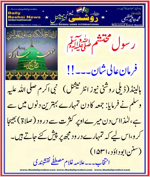 فرمان عالی شان ۔۔۔!! / ہالینڈ کی خبریں, فرمان رسول / By Daily Roshni News نبی اکرم صلی اللہ علیہ وسلم نے فرمایا: جمعہ کا دن تمہارے بہترین دنوں میں سے ہے، لہٰذا اس دن میرے اوپر کثرت سے درود ( صلاۃ ) بھیجا کرو، اس لیے کہ تمہارے درود مجھ پر پیش کئے جاتے ہیں ۔ (سنن ابوداؤد ،۱۵۳۱) جمعہ مبارک