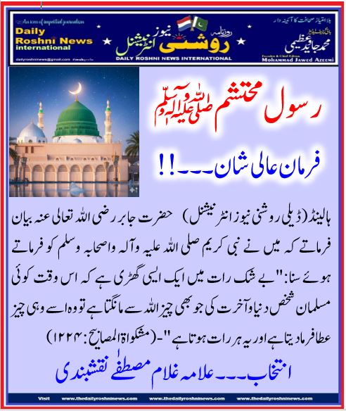ہالینڈ(ڈیلی روشنی نیوز انٹرنیشنل) حضرت جابر رضی اللہ تعالی عنہ بیان فرماتے کہ میں نے نبی کریم صلی اللہ علیہ وآلہ واصحابہ وسلم کو فرماتے ہوئے سنا:”بے شک رات میں ایک ایسی گھڑی ہے کہ اس وقت کوئی مسلمان شخص دنیا و آخرت کی جو بھی چیز اللہ سے مانگتا ہے تو وہ اسے وہی چیز عطا فرما دیتا ہے اور یہ ہر رات ہوتا ہے” – (مشكواۃ المصابيح: ۱۲۲۴)