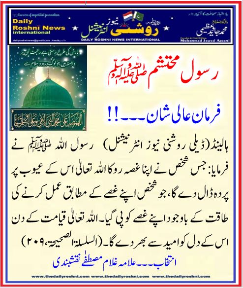 ہالینڈ(ڈیلی روشنی نیوز انٹرنیشنل) رسول اللہ ﷺ نے فرمایا:جس شخص نے اپنا غصہ روکا اللہ تعالیٰ اس کے عیوب پر پردہ ڈال دے گا، جو شخص اپنے غصے کے مطابق عمل کرنے کی طاقت کے باوجود اپنے غصے کو پی گیا۔ اللہ تعالیٰ قیامت کے دن اس کے دل کو امید سے بھر دے گا۔(السلسلۃ الصحیحۃ ، ۲۰۹)