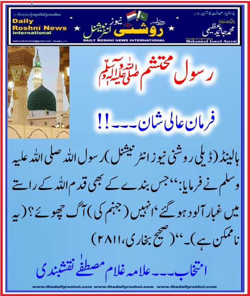 فرمان عالی شان ۔۔۔!! / ہالینڈ کی خبریں, فرمان رسول / By Daily Roshni News ہالینڈ(ڈیلی روشنی نیوز انٹرنیشنل(رسول اللہ صلی اللہ علیہ وسلم نے فرمایا :“جس بندے کے بھی قدم اللہ کے راستے میں غبار آلود ہو گئے ‘ انہیں ( جہنم کی ) آگ چھوئے؟ ( یہ نا ممکن ہے ) ۔“ (صحیح بخاری،۲۸۱۱)